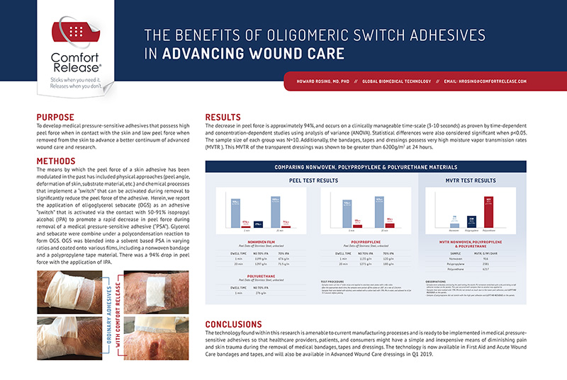 A recent article published in Wound Source by Laurie Swezey, RN, CWOCN titled, “How to Decrease Pain Associated with Wound Dressing Changes,” demonstrates the potential for the Comfort Release® Smart Switchable Pain – Free adhesive technology as the number one remedy cited is to choose the correct dressing that won’t adhere to the wound bed and can be easily removed.
